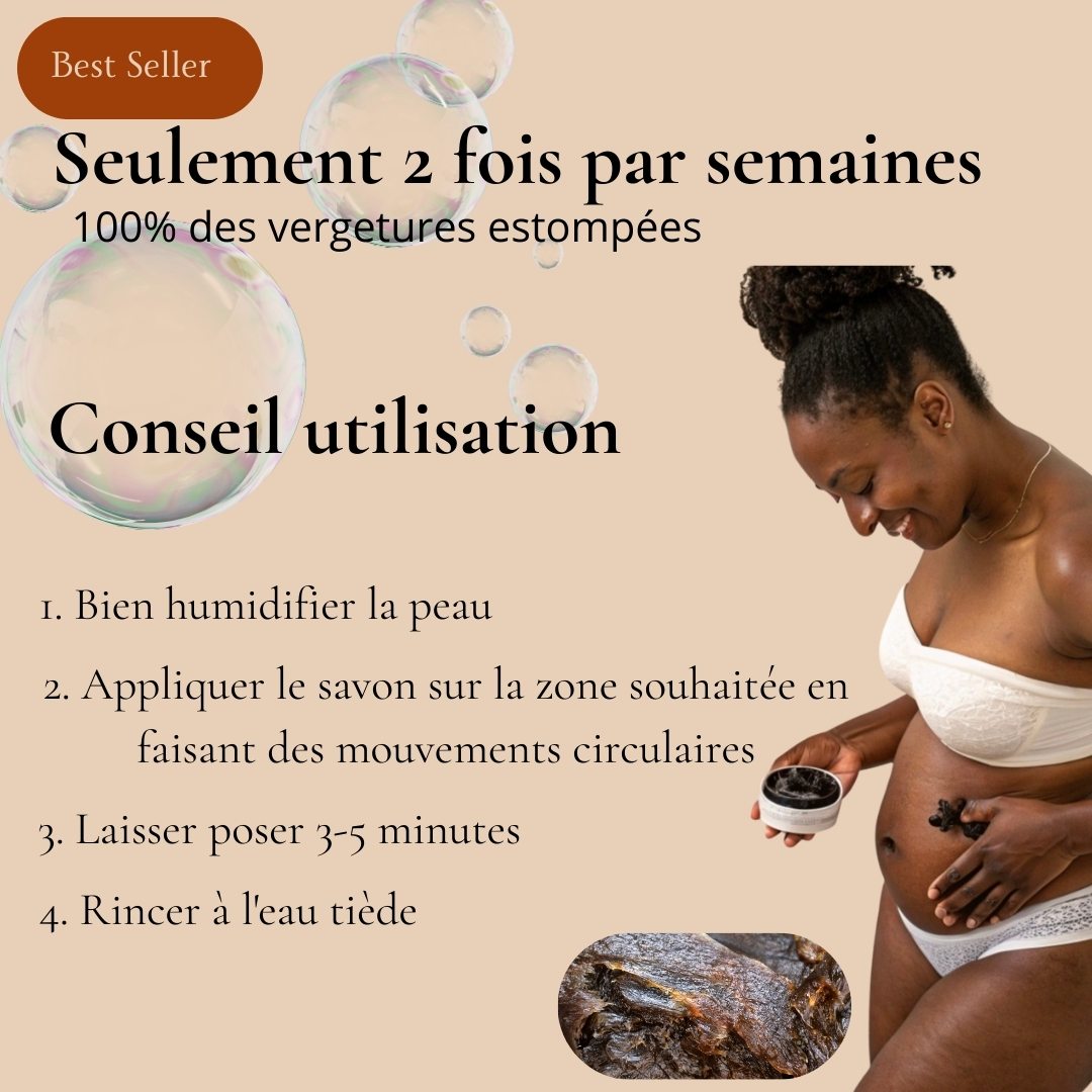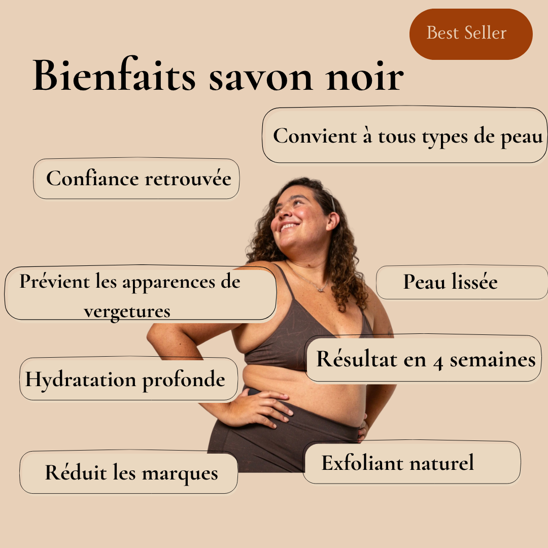 Oui. Formulé avec des ingrédients naturels reconnus pour leurs propriétés régénérantes, notre savon noir aide à estomper visiblement les vergetures, qu’elles soient récentes ou plus anciennes. La peau devient progressivement plus lisse, plus souple et mieux hydratée.