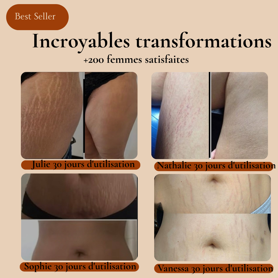 Un soin naturel qui atténue visiblement les vergetures et redonne confiance, prouvé par la satisfaction de la majorité de nos utilisatrices.